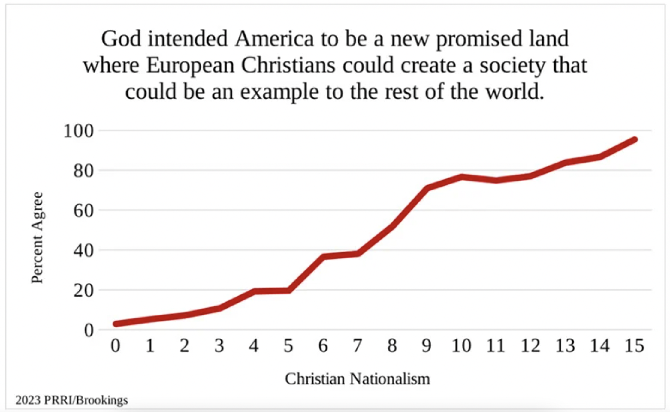 In 2023, a survey on Christian Nationalism in the United States from the Public Religion Research Institute and The Brookings Institution measured the prevalence of Christian Nationalism by gauging how much Americans agreed with the following five statements: