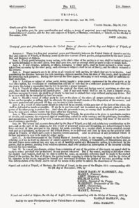 Barlow forwarded the treaty to Washington, D.C., where Article 11 raised no eyebrows. On May 26, 1797, Adams submitted the treaty to the Senate with a short note that read, “I lay before you, for your consideration and advice, a treaty of perpetual peace and friendship between the United States of America and the Bey and subjects of Tripoli, of Barbary, concluded, at Tripoli, on the 4th day of November, 1796.”