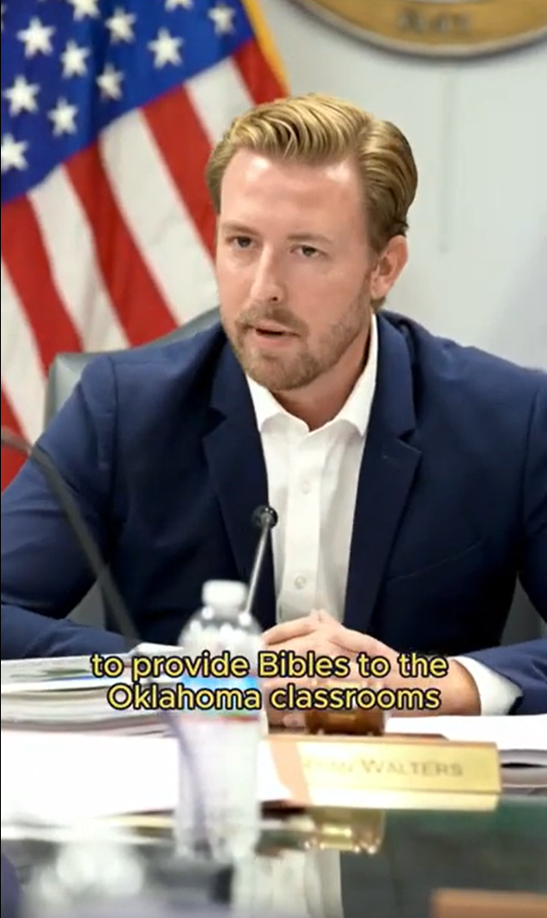 First, in 2024, Oklahoma State Superintendent of Public Instruction Ryan Walters tried to spend millions of Oklahoma taxpayer dollars to put a Bible in every fifth- through twelfth-grade public-school classroom in the state. And he’s ordered Oklahoma public-school teachers to incorporate the Bible into their everyday lessons.