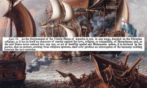 Perhaps Adams’s most enduring contribution to the conversation about church and state in the United States is the Treaty of Tripoli, negotiated during the Washington administration but ratified during Adams’s presidency. In the final decade of the eighteenth century, the United States, a fledgling nation, had no navy to protect its merchant ships; Britain had protected American maritime interests before the Revolutionary War, and France had done so during the Revolution. As a consequence, American merchant ships were vulnerable to privateering (state-sanctioned piracy); several vessels had been captured in the Mediterranean for ransom by the Barbary States: Algiers, Tunis, Morocco, and Tripoli. Their cargoes were confiscated, and crew members, especially Christians, were taken captive. Contemporary accounts suggest that Tunis alone harbored twelve thousand Christian slaves.