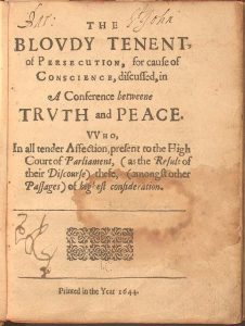 Convicted in court of demanding equal religious freedom for all that could only be achieved through church-state separation, Williams was banished from the Puritan Massachusetts Bay Colony in 1635. Thereafter establishing the Rhode Island colony upon the foundation of church-state separation and religious freedom for all equally, Williams, in his 1644 book The Bloody Tenet of Persecution, wrote that “enforced uniformity [of religion] (sooner or later) is the greatest occasion of civil war, ravishing of conscience, persecution of Christ Jesus in his servants, and of the hypocrisy and destruction of millions of souls.”